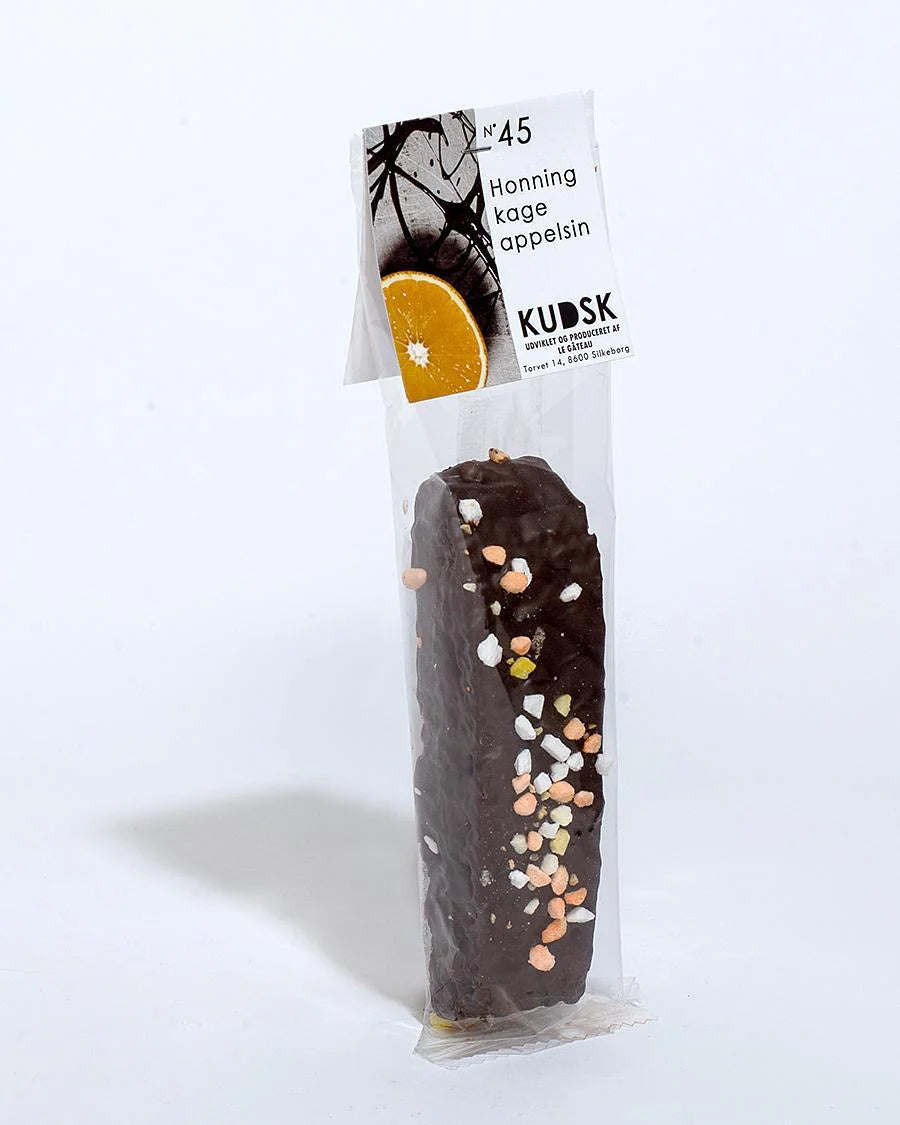 KUDSK honningkage snitter med appelsinkompot og mørk chokolade..