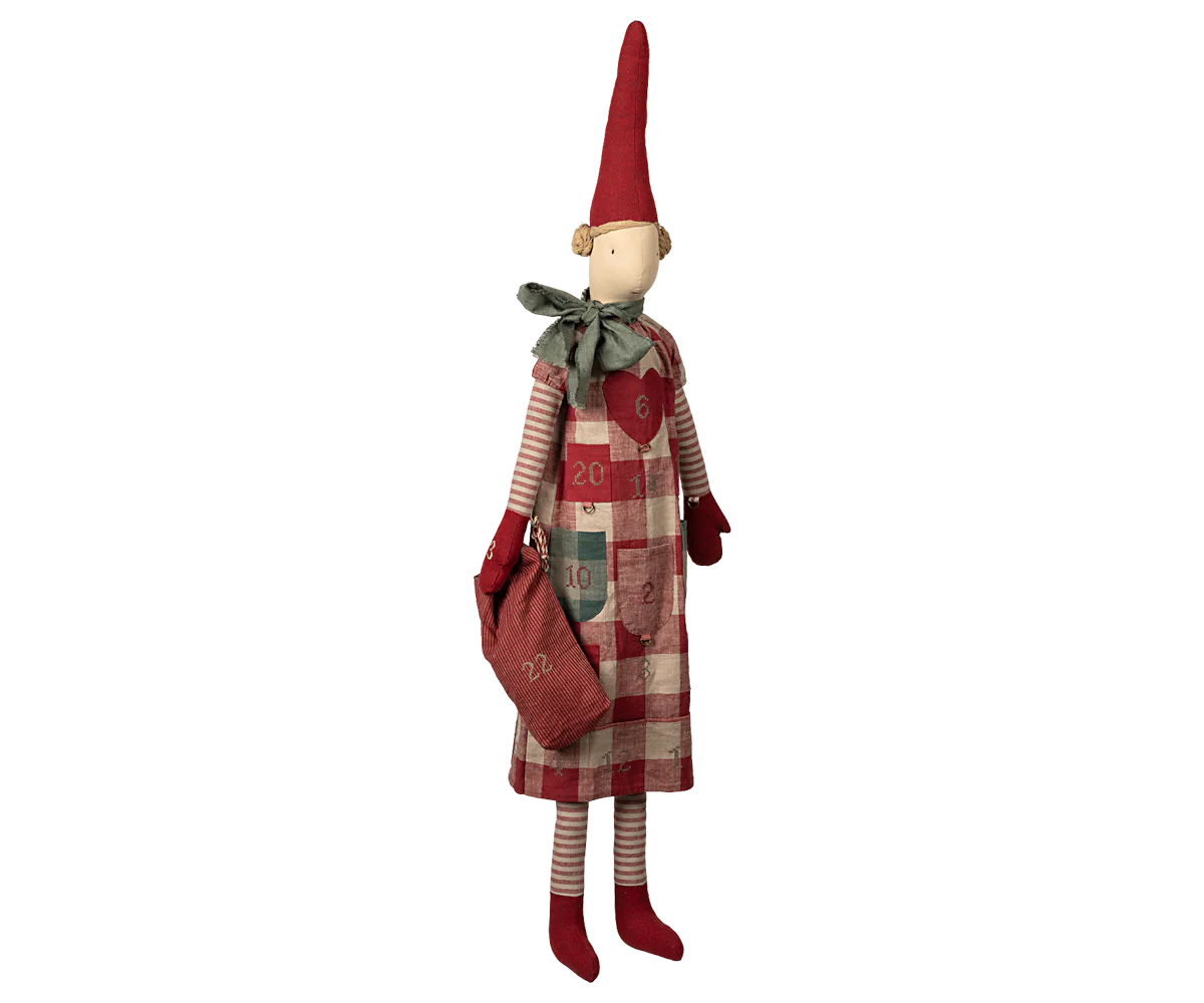 Kalenderpigen har 24 ringe/lommer, som du kan binde små gaver eller slik fast til – én til hver dag før jul.