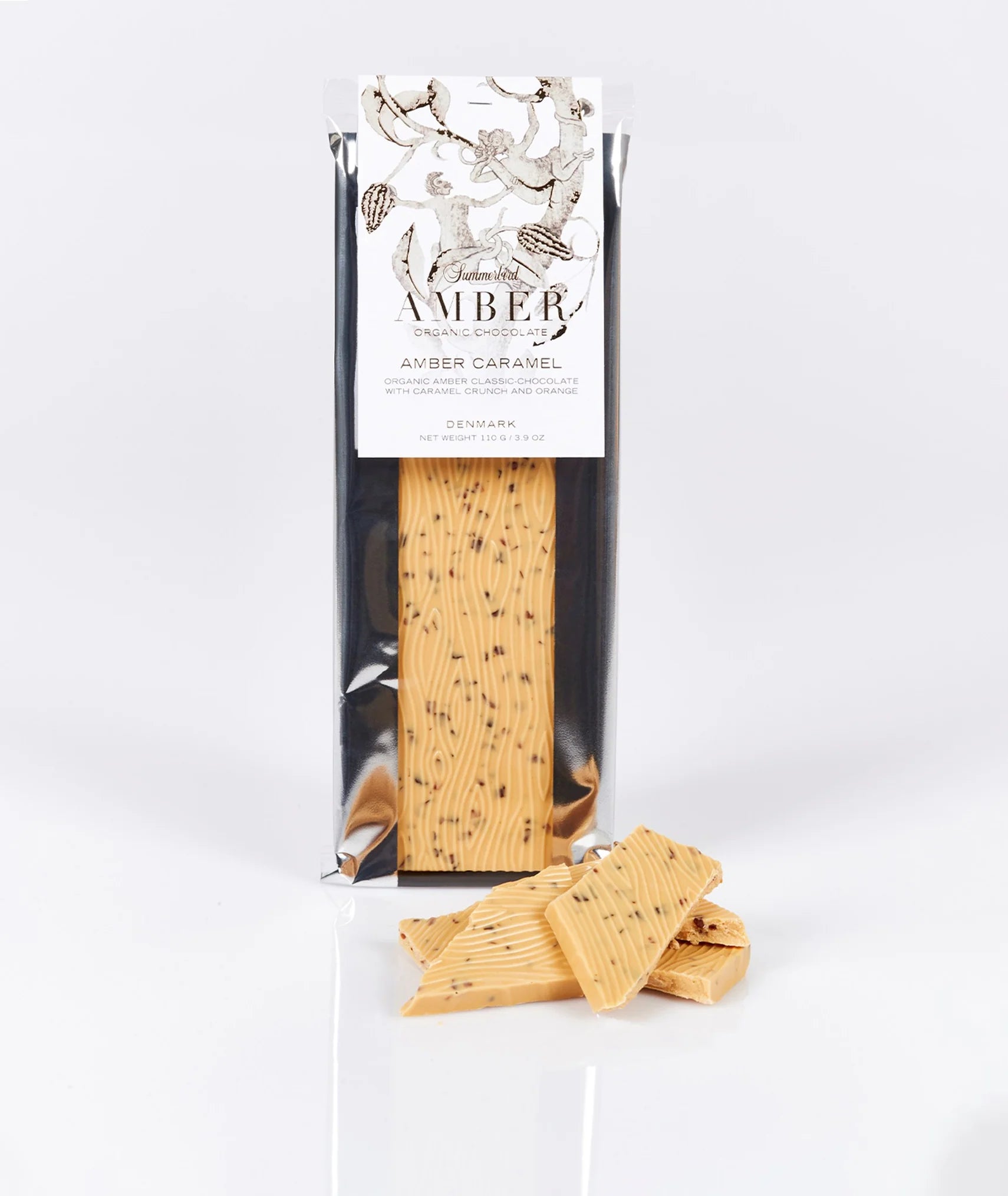 Gylden Amber Classic-chokolade er i denne raffinerede udgave parfumeret ganske let med orange og afslutningsvist vendt med knuste sprøde karamelflager.