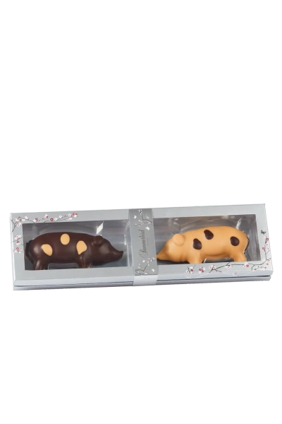 To klassiske julegrise af ren marcipan, lavet på stenvalsede middelhavsmandler.
