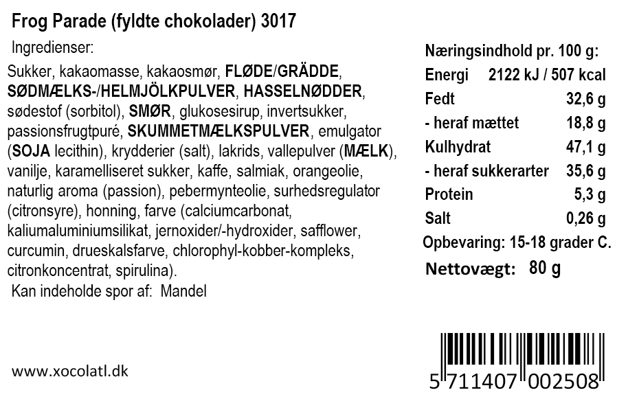 8 fyldte chokoladefrøer med orange, nougat, mørk ganache,