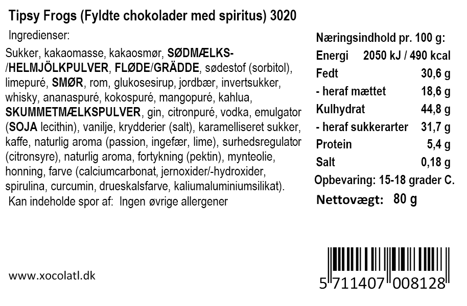 8 chokoladefrøer med alkohol. Delikate smage med gin hass, whisky, pina colada, dark ‘n’ stormy, mojito, rom, strawberry daiquiry og espresso martini